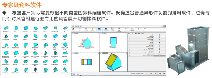 武漢華宇誠數(shù)控生產(chǎn)的通風(fēng)管道數(shù)控等離子切割機,針對風(fēng)管展開切割進行了專門優(yōu)化。切割速度更快、切割精度更高、切割效果更好。并搭配專門的風(fēng)管展開軟件,用戶只需選擇要切割的風(fēng)管類型,輸入相應(yīng)尺寸參數(shù),便可自動排料、自動生成加工程序,用戶直接用U盤在切割機上調(diào)入加工程序切割即可。