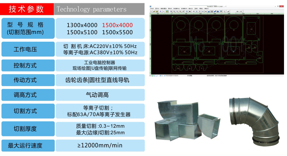 特別針對通風(fēng)管道行業(yè)專門用于切割2mm以下的薄、中碳鋼板、 不銹鋼板、鋁板、銅板、鍍鋅板、白鐵皮、合金板等多種板材材料,快速風(fēng)管等離子切割機,效果佳、無掛渣和毛刺;在使用時直接連接普通配置的臺式電腦,運用文泰軟件或AutoCAD繪圖軟件直接用于繪制圖形,不需轉(zhuǎn)換,直接切割,并可進行簡單的排料,工件共邊設(shè)置,購買本公司此款設(shè)備可享受免費送貨上門、安裝調(diào)試及培訓(xùn)、包教包會!